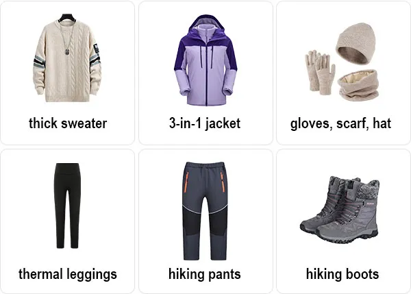 A hat, scarf, and gloves are must-haves to protect against cold winds.