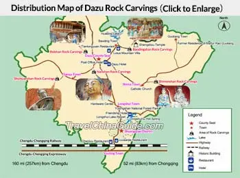 Dazu County, reputed as 'the county of rock carving' is located at the southeast of Sichuan province. It is 168 miles (about 271 kilometers) from Chengdu on its west and 104 miles (about 167 kilometers) from Chongqing on its east. The whole county has an area of 540 square miles (about 1,400 square kilometers), and it owns a history of more than 1,200 years since it came into existence in 758 during the Tang Dynasty (618-907).