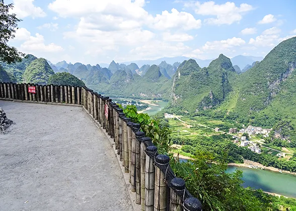 Standing on the three-storey sightseeing stage, you can look over a panorama of Yangshuo landscape. The meandering Li River, embraced by rolling hills on both banks, makes a 180-degree bend here. The sea of clouds, sunrise and rosy sunglows will surely not disappoint you. Looking downwards, boats and bamboo rafts sail down the river. Fishermen work on the river side. White farming houses are scattered here and there on the vast fields. In the distance, hills rise one above the other, partly visible and partly hidden. In sunny days, the water surface is checkered with sunlight and shadows, making you believe that you have set foot on a wonderland.