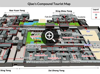 Qiao Family Compound takes an area of 10,637 square meters (114,500 sq ft) with totally 6 large courtyards, 20 small courtyards and 313 rooms, including rooms for owners, rooms for customers, rooms for servants, study rooms, kitchens and an ancestral shrine. The whole complex looks like double Chinese characters “Xi (喜)” standing together from a bird-eye view. “Xi” in Chinese means joy and happiness. The complex was built in such a structure to express a good wish.