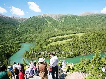 There are six bays along the lake and each of them holds a marvelous tale. A 'roche moutonnee', bedrock corroded by glaciers, can be found in the first bay. It looks like a sleeping sheep appreciating the beautiful lake and welcoming visitors from outside world. The second bay is the deepest point of the lake and also the place where monsters are often 'spotted'. It is said that some local livestock have been dragged into water by the Kanas Lake monster! The third bay is a nature platform for enjoying the marvelous lake, the fourth bay holds a lovely isle covered by trees, and a hill of magpies exists in the fifth bay. The sixth bay, which is at the end of the lake, is admired as a natural wonder by all visitors. Gathered here is a 2,000-meter-long (about 6,562 ft) bank of dead trees. No one can explain why these trees did not float downriver, but people say that it is because even the trees don't want to leave the beautiful lake. There is a pavilion named Fish Watching Pavilion on the other bank of the lake. Because it is located on a hill, visitors can look down on the beautiful scenery of the whole area.