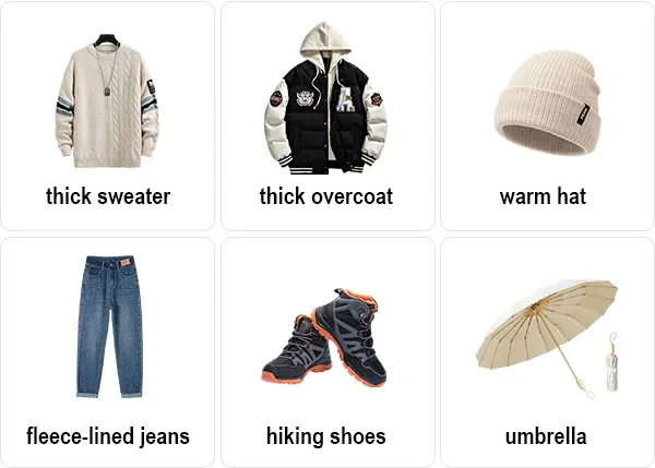 Bottom Clothing: Thick long pants are a must, including thick jeans and fleece-lined sweatpants. For an evening outing, especially in the mountain areas, adding thermal leggings greatly improves comfort.