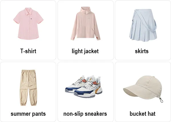 Bottom Clothing: You are advised to wear loose shorts or skirts. It’s ok to wear long light pants in the mountainous areas, helpful for preventing insect bites.