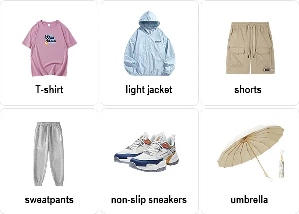 Bottom Clothing: Loose and breathable summer pants, shorts, and skirts are all OK choices. But if you plan to visit the mountainous areas, long pants are more recommended, as they offer better protection against the sun and insects.