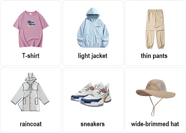 Bottom Clothing: It’s ok to wear long summer pants or shorts according to the weather conditions. If you plan to visit the mountainous areas, you are advised to prepare waterproof hiking pants.