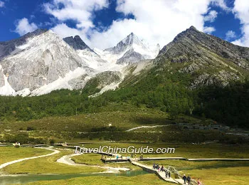 These following three snow-clad mountains, Mts Chenrezig, Jambeyang and Chanadorje, standing straightly, forming the shape of a triangle. Due to its special geographical environment and natural climate, it has formed a unique natural landscape, and it is the most intact natural ecosystem in China. Travelers can go hiking in the forest in the mountainside, view the waterfalls and lakes. The snowy peaks, glaciers, meadows and wild animals will let you find natural enjoyment in this pure land.