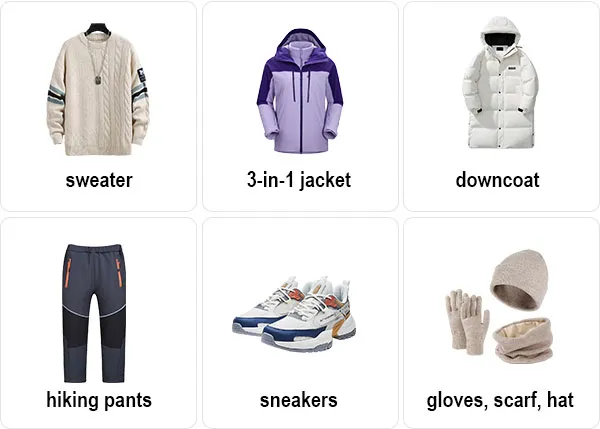 Bottom Clothing: Thermal leggings paired with fleece-lined hiking pants are perfect for mountainous areas. If you decide to hang around in the urban area, just pick thermal leggings and jeans.