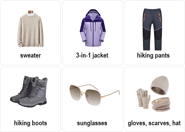 Bottom Clothing: In Northwestern Sichuan, thermal leggings paired with hiking pants are perfect for your outdoor exploration. For the rest parts of Sichuan, it’s ok to prepare thick jeans and sweatpants.