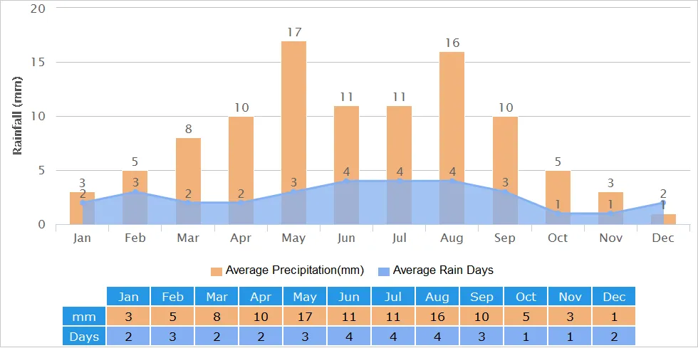 Overall, precipitation throughout the year is low across all areas of Kashgar. On average, the monthly value does not exceed 20 mm, with some months even falling below 10 mm, and the average number of rainy days per month does not exceed 5. However, precipitation tends to be slightly higher in areas at higher elevations.