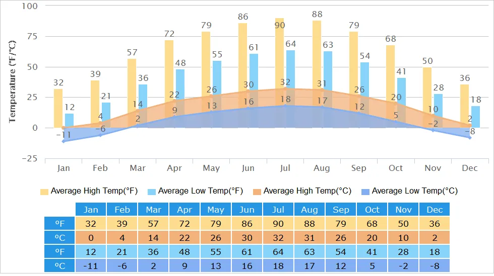 Due to the complex topography that includes plains as well as mountains, valleys, and plateaus, the temperature varies among different areas. For example, Tashkurgan in the Pamir Plateau experiences temperature approximately 10℃ (18°F) lower than that of most areas like Kashgar City.