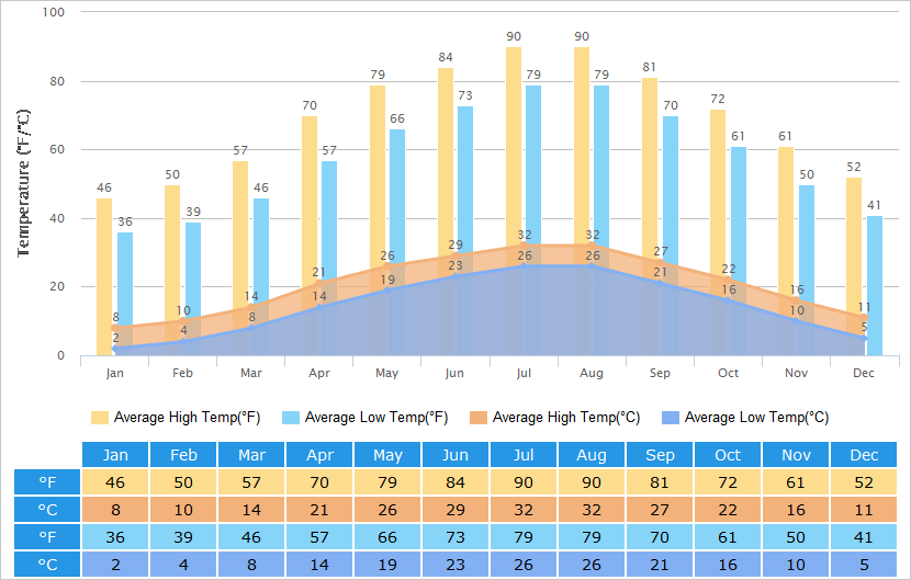 There are four distinct seasons with sunlight of 1848 hours and the average temperature is 17.9