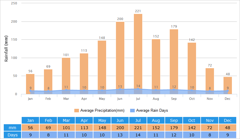 Kyoto weather is also characterized by high humidity all year around, and the average monthly humidity is above 60% at least. The yearly precipitation is about 1,500mm averagely and the rainy season from early June to mid-July has the most rainfall in Kyoto.