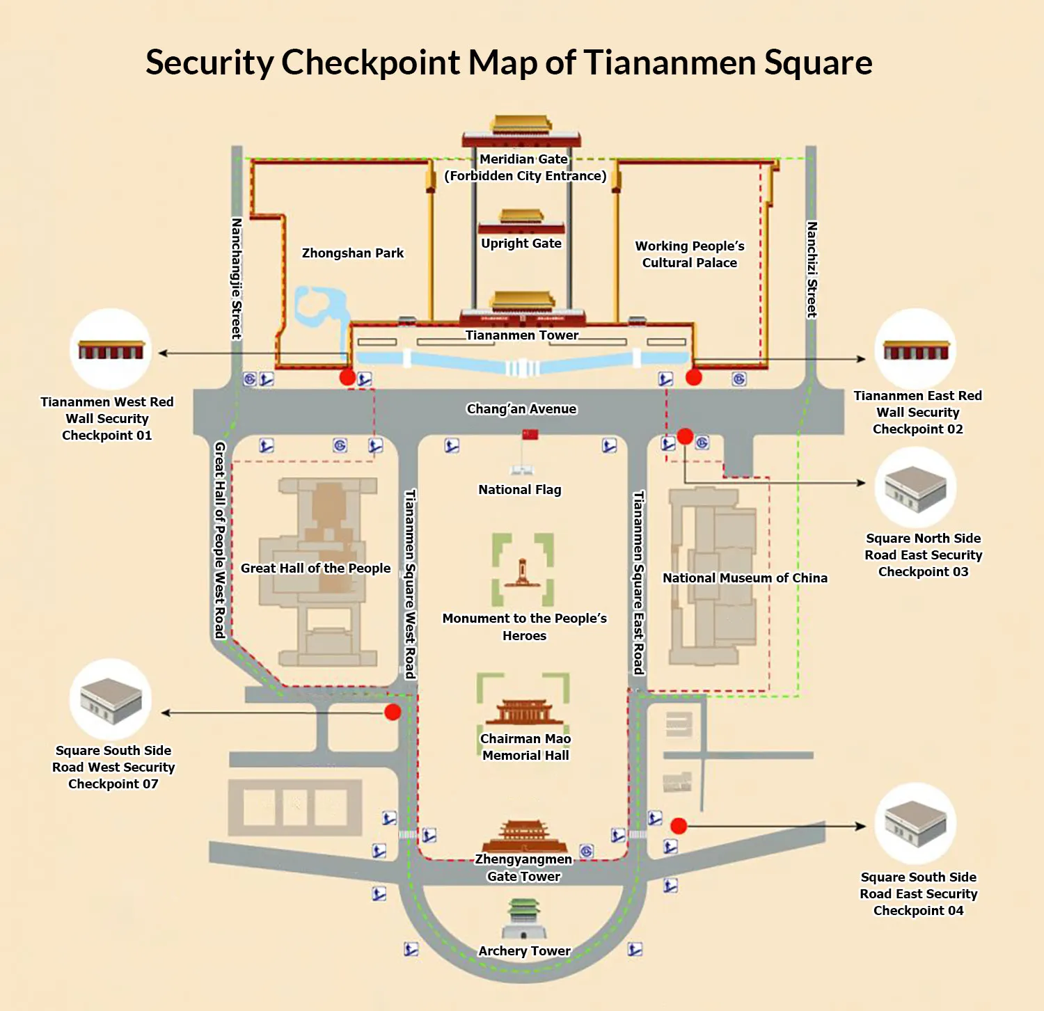 1. Security checks at Tiananmen Square are strict and can be slow. Minimize your belongings. It's best to carry only your passport, phone, light snacks, and bottled water. Note that sprays, selfie sticks, and drones are strictly prohibited, so please avoid bringing them.