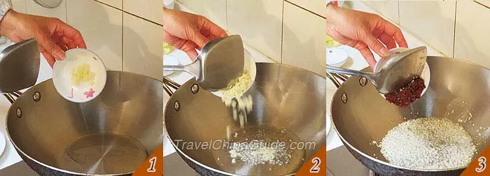 Add cooking oil. When it is hot, add in chopped ginger and garlic and stir-fry for 5-10 seconds. Add broad bean paste and fry for 10 -15 seconds.