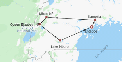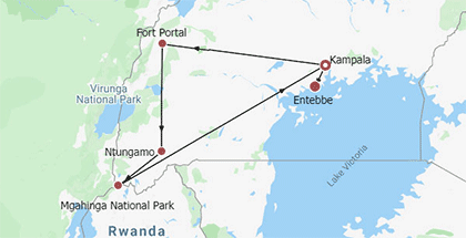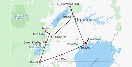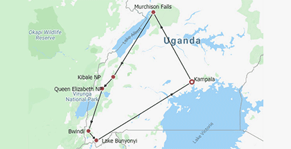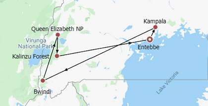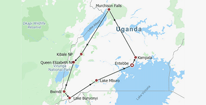 Generally speaking, 6-8 days are needed to visit the main parks of Uganda. After your arrival at Entebbe, stay overnight in Kampala or have a half-day sightseeing tour. The gorilla trekking in Bwindi and chimpanzees trekking in Kibale are unique experiences as you get up close with them and take incredible photos. Queen Elizabeth National Park and Murchison National Park are particularly highlights for wonderful wildlife safaris, picturesque landscapes, exciting Nile cruise and waterfalls. If you want to explore more in Uganda, another 2 days at Lake Mburo National Park and Ziwa Rhino Sanctuary are recommended.